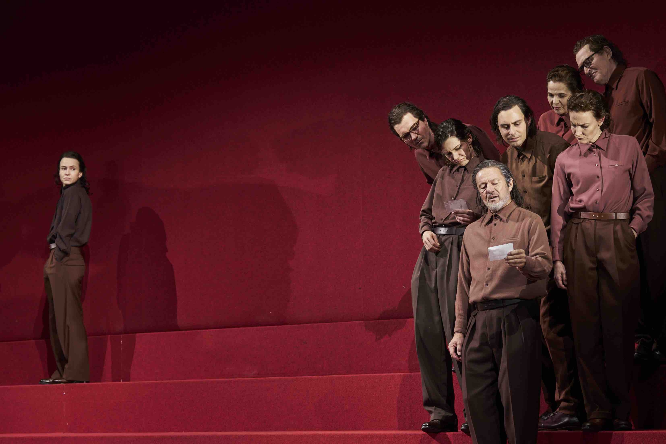 In der Bühnenfassung der schwedischen Regisseurin Therese Willstedt und Jeroen Versteele spielen vier Damen (Lilith Häßle, Alexandra Henkel, Andrea Wenzl und Ines Marie Westernströer) und vier Herren (Aaron Blanck, Norman Hacker, Seán McDonagh und Jörg Ratjen) in braunschattiertem Outfit den Erzähler und stehen dabei auf einer bühnenfüllenden riesige roten Treppe (Bühnenbild: Mårten K. Axelsson). Die acht Stimmen geben dem Text Farbe, eine Art Dramatik entsteht dabei freilich nicht – auch wenn zeitweise eifrig mit Requisiten wie Geweihen, Kostümen und Musikinstrumenten agiert wird. Warum ein Roman eines Autors auf die Bühne muss, der nicht wenige Stücke hinterließ, kann dieser Abend nicht schlüssig erklären, wenngleich bei der Premiere die Leistungen des Ensembles zurecht heftig beklatscht wurden. Das gerade jetzt wieder in Oberösterreich auf einem Bauernhof obskure Schießübungen aufgeflogen sind, setzt dem Thema allerdings schon eine eigene Pointe. Foto: Tommy Hetzel/Burgtheater