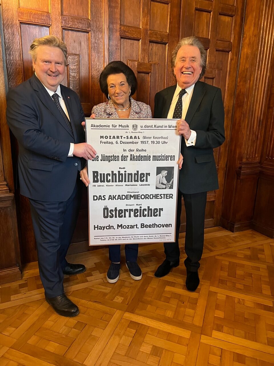 Im Anschluss an das Konzert überreichte Bürgermeister Michael Ludwig dem gefeierten Tastenvirtuosen ein gerahmtes Plakat aus dem Jahr 1957, in dem der Auftritt des 11-jährigen Wunderkindes Rudi Buchbinder am 6. Dezember 1957 im Wiener Konzerthaus mit Werken der drei Wiener Klassiker Haydn, Mozart und Beethoven angekündigt wird. Rudolf Buchbinder und seine Frau Agi strahlten um die Wette. Ein frühes Geburtstagsgeschenk für den charismatischen Klavierkünstler, denn am 1. Dezember feiert Rudolf Buchbinder seinen 80. Geburtstag. Ad multos annos!