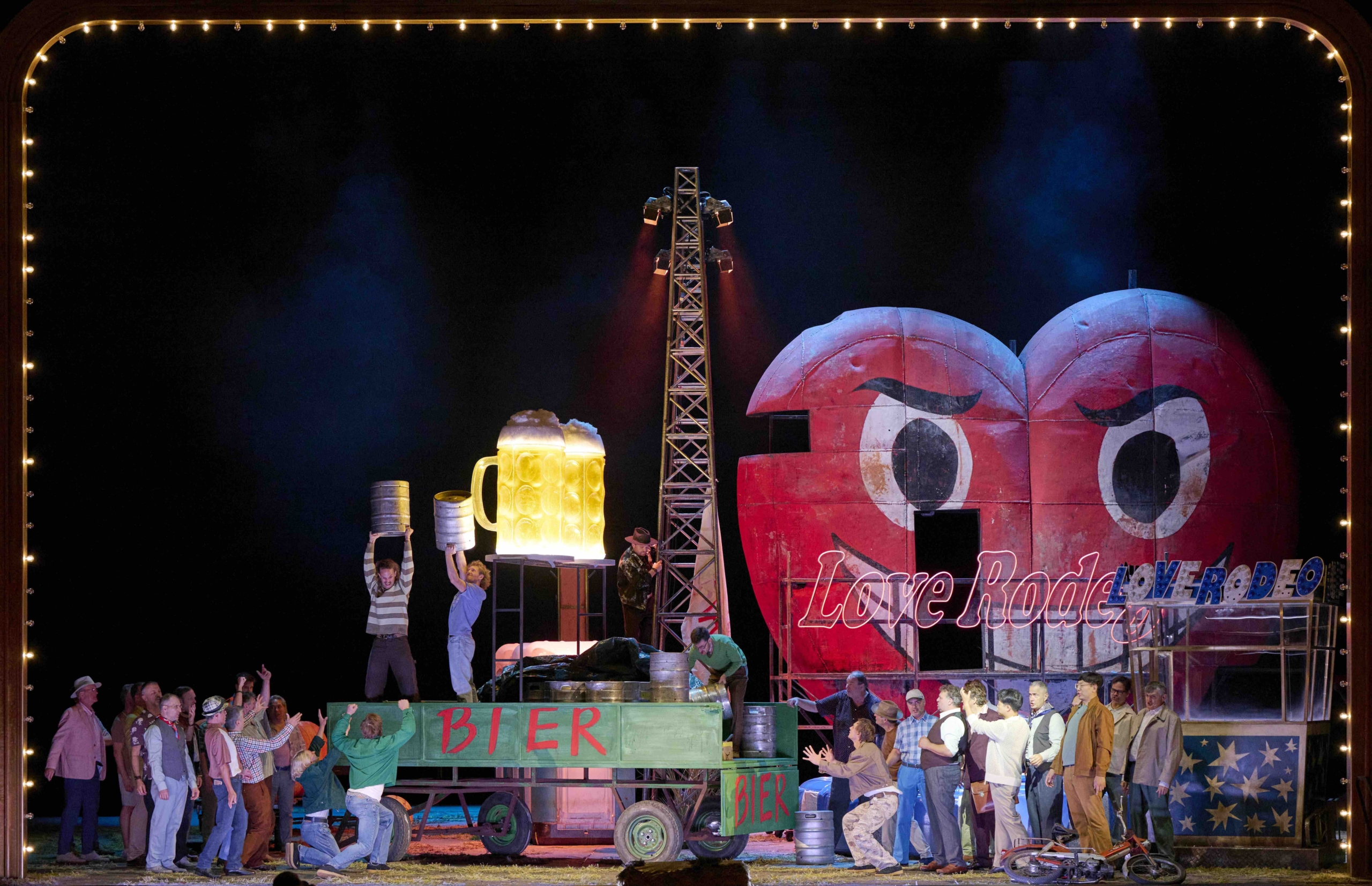 Friedrich Smetanas „Die verkaufte Braut“ kommt in einem völlig neuen Gewand daher. Regisseur Dirk Schmeding verlegt das ursprünglich böhmische Dorf kurzerhand in ein schäbiges Rummelplatz- und Zirkusmilieu, das von Anfang an die Szenerie dominiert. Was als moderne Metapher gedacht sein mag, wirkt zunehmend überladen: Riesige Würste, Klos, Herz-Smileys und Teddybären schaffen eine kunterbunte Bilderflut, die mehr ablenkt als erzählt.